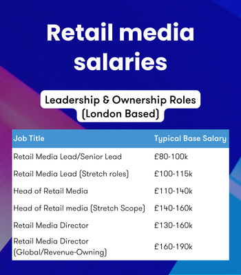 Retail media salaries vary depending on experience and responsibility. Entry level roles typically range from £35,000 to £55,000, mid-level managers often earn £50,000 to £70,000, while senior managers command £70,000 to £95,000. Leadership roles such as Head of Retail Media or Retail Media Director can exceed £130,000 when responsible for supplier revenue and commercial partnerships.