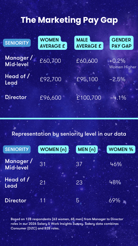 The following table combines salary data across Consumer Brand (D2C) and B2B roles, self-reported by respondents in our 2026 Salary & Work Insights Survey, using midpoint salary estimates from reported salary bands. In total, we surveyed 63 women and 66 men from Manager up to Director level.